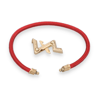 Bracelet Louis Vuitton Collection LV Fin Upside Down Play LV Volt en or jaune avec cordon polyamide rouge passion en taille 18. ref : Q05395. Prix neuf : 2425€