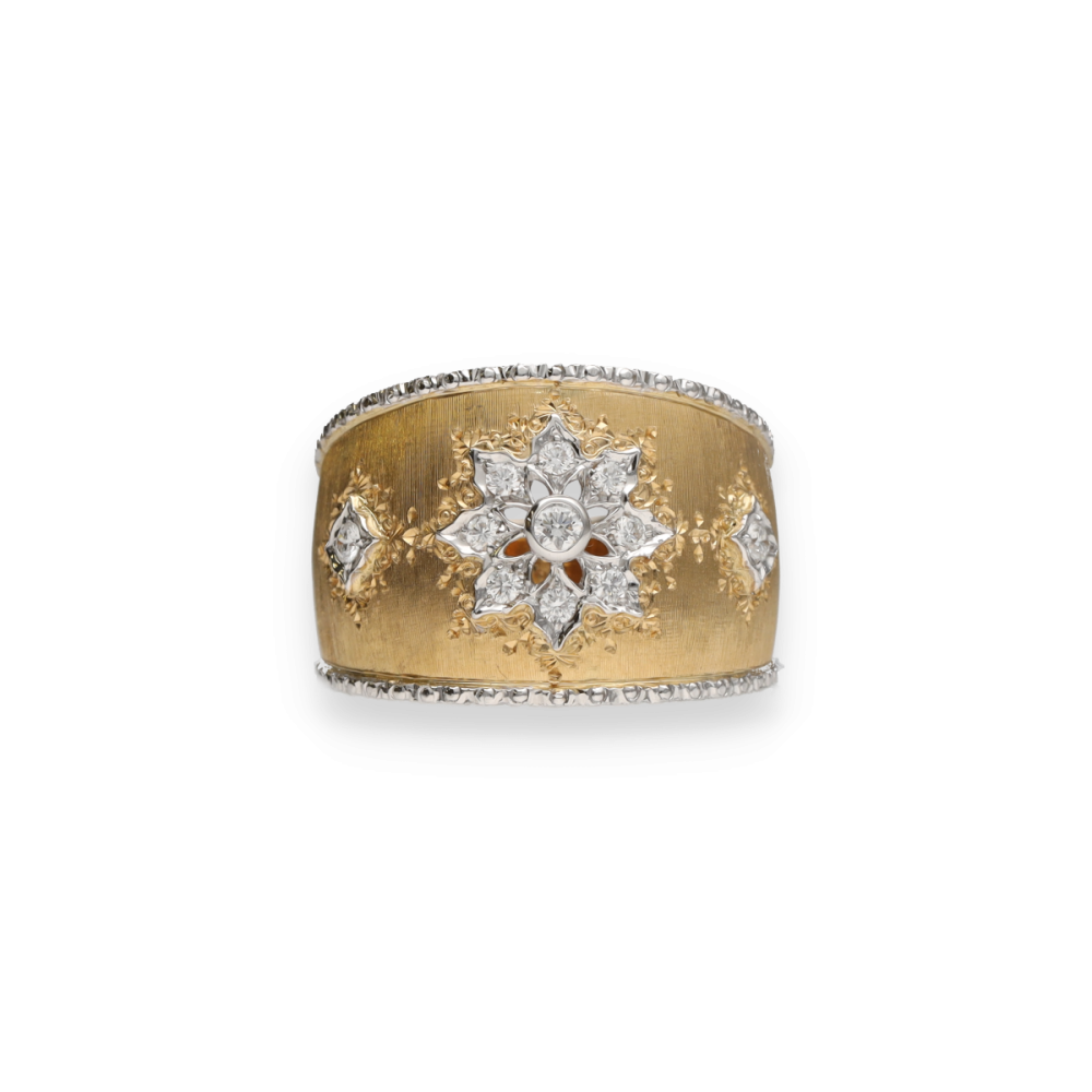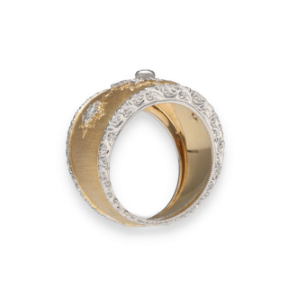 Bague Macri signée Mario Buccellati, en or jaune et blanc 18k, ornée de diamants. Travail italien exceptionnel. Taille 54.