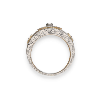 La monture alterne or jaune et or blanc 18k, harmonie sublimée par un sertissage de diamants brillants, apportant éclat et élégance à l’ensemble.