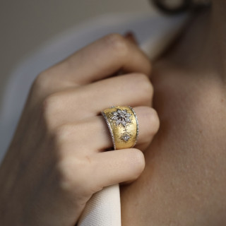 Pièce emblématique de la haute joaillerie italienne, cette bague est signée Mario Buccellati, l’un des bijoutiers les plus prestigieux au monde.