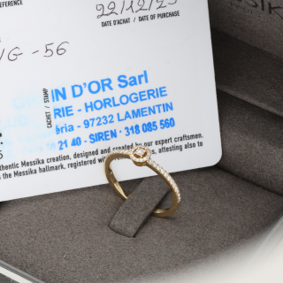 Bague Messika Joy XS en or jaune 18 carats, sertie de 0,20 ct de diamants G-VS. Taille 56, poids 2,4 g. Livrée full set 2023 avec écrin et certificats d’origine Messika. Prix neuf : 1 830 €.
