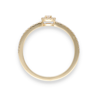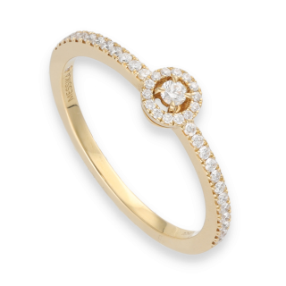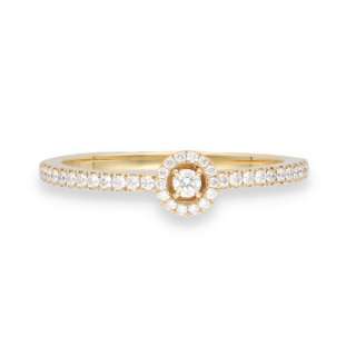 Réalisée en or jaune 18 carats, elle met en valeur un diamant central taille brillant, entouré d’un délicat pavage de diamants G-VS totalisant 0,20 carat.