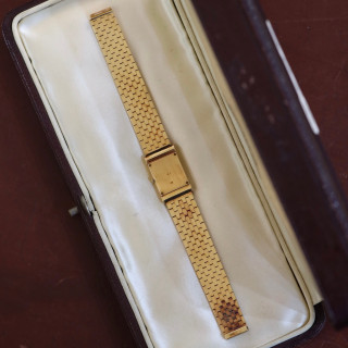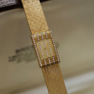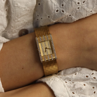Cette version, réalisée vers 1990, est confectionnée en or jaune 18k et sublimée par environ 1.0 carat de diamants ronds, apportant éclat et élégance. Son boîtier rectangulaire de 17 × 27 mm s’accompagne d’un bracelet en or massif de 19 cm, offrant confort et prestige au poignet.