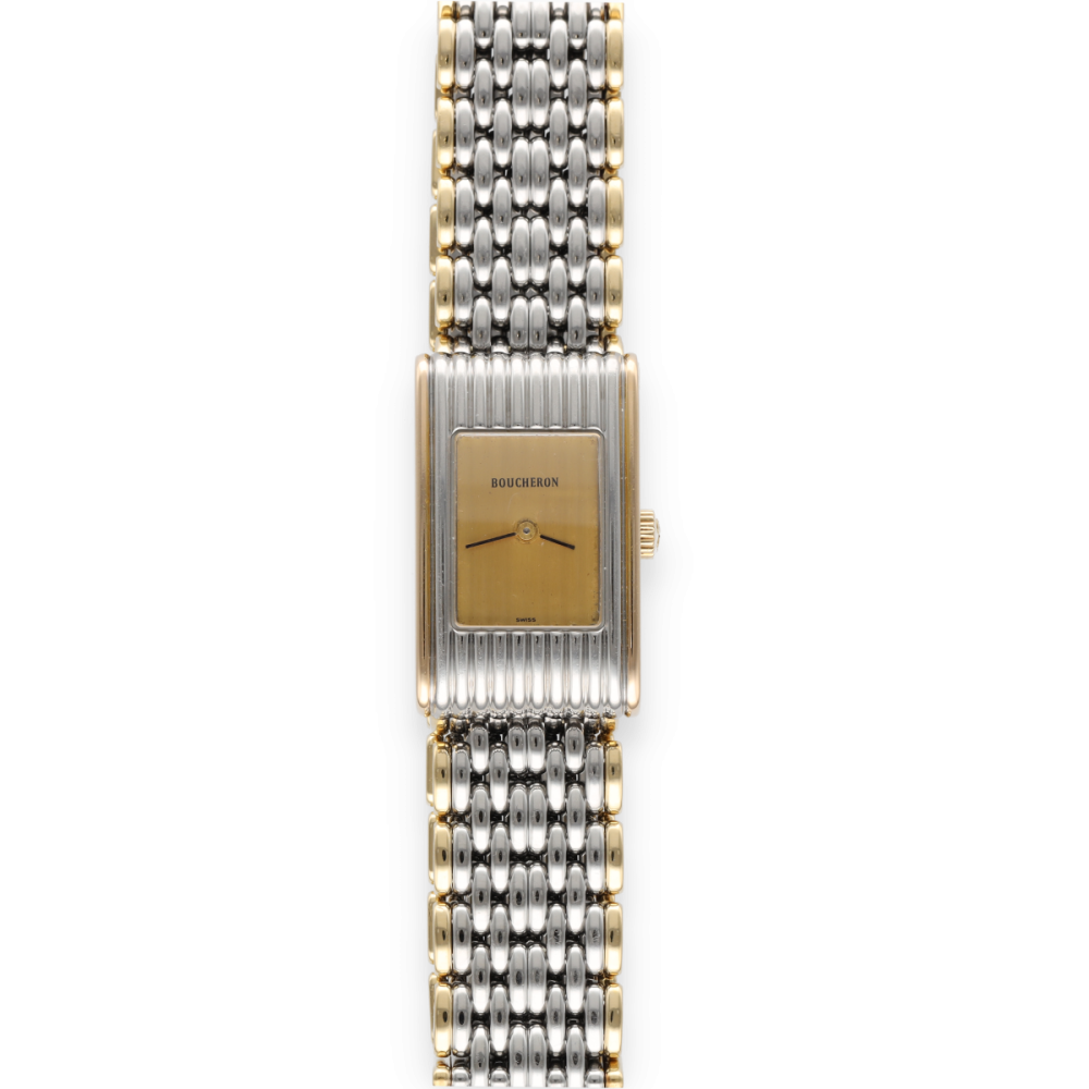 Montre Boucheron Reflet de Dame en or jaune 18k et acier, mouvement quartz, livrée full set 2004 avec boîte, papiers d’origine et 4 bracelets interchangeables. Un modèle féminin emblématique de la Maison Boucheron.