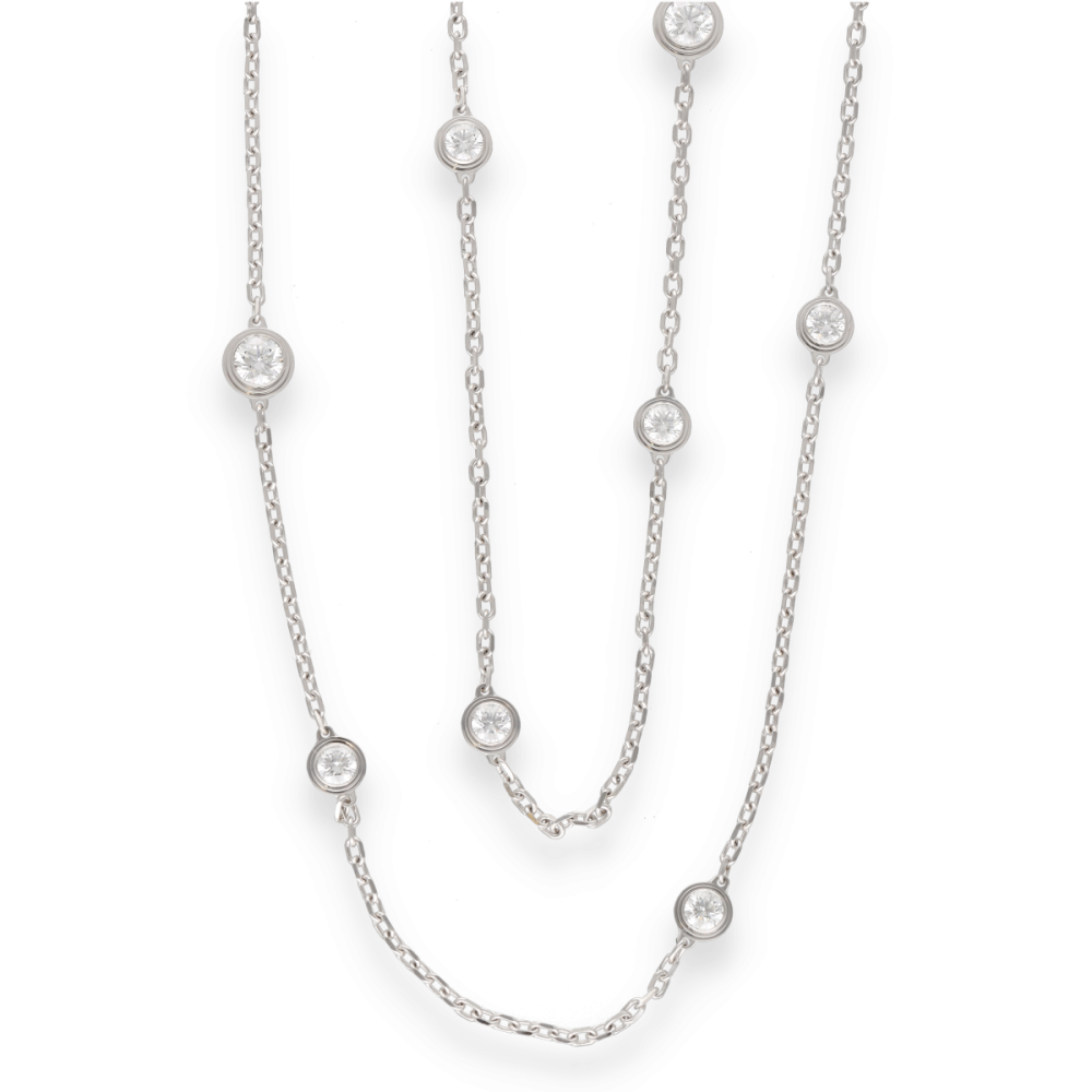 Réalisé en or gris 18k, ce collier long de 92 cm est serti de 20 diamants ronds brillants d’un éclat remarquable, pour un poids total d’environ 2,00 carats.