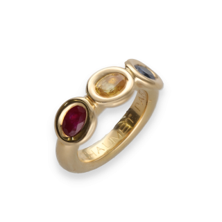 Réalisée en or jaune 18k, elle est sertie de saphirs bleus et de rubis rouges finement disposés, créant un subtil contraste entre chaleur et profondeur.
