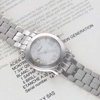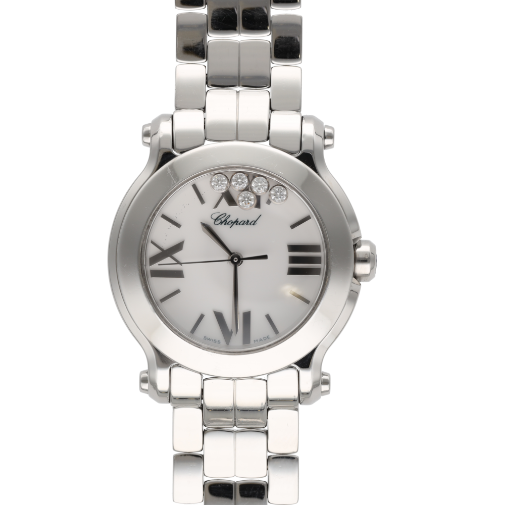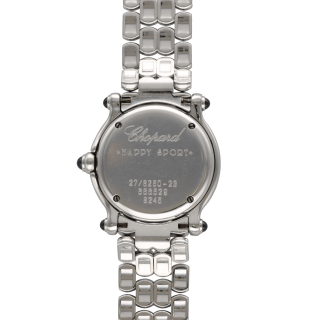 Iconique montre Chopard Happy Sport référence 27/8509 en acier, animée par un mouvement quartz. Boîtier de 30 mm, ornée de 5 diamants mobiles, modèle de 2010.