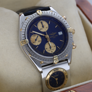 Cette référence B13048, produite vers 1990, associe acier et or, créant un contraste élégant entre sportivité et raffinement. Le design caractéristique du Chronomat se distingue notamment par sa lunette tournante avec cavaliers, signature visuelle forte de la collection.