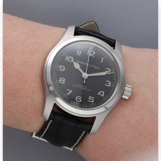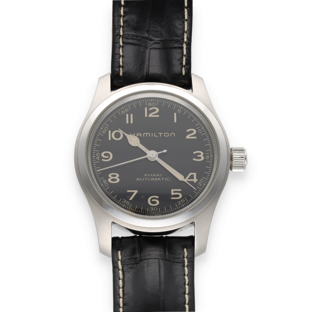 Son boîtier en acier inoxydable de 42 mm abrite un mouvement automatique Hamilton H-10, offrant une réserve de marche de 80 heures, gage de fiabilité et de performance.