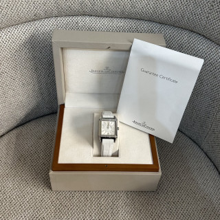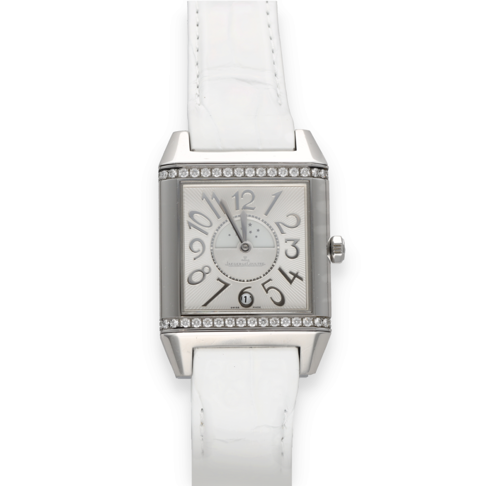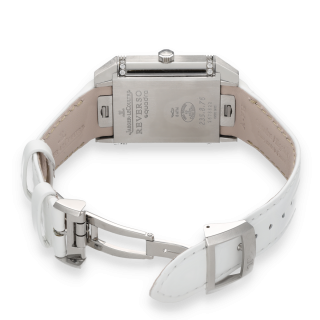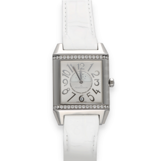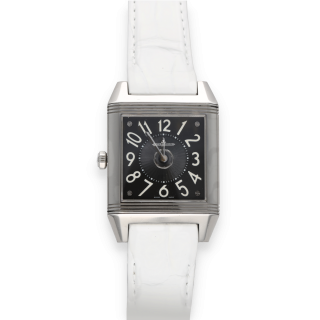 Montre Jaeger-LeCoultre Reverso Squadra Duo mécanique en acier, sertie de diamants, référence 235.8.76, année 2010. Livrée full set avec écrin et papiers d’origine. Bracelet Jaeger blanc neuf.