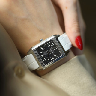 Son boîtier réversible, emblématique de la collection Reverso, révèle deux cadrans distincts permettant l’affichage de deux fuseaux horaires, une prouesse technique signée JLC.