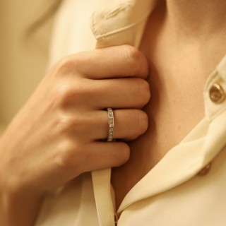 Les diamants, finement sertis, offrent une brillance homogène et délicate, captant la lumière à chaque mouvement. Leur qualité supérieure confère à cette alliance un éclat précieux, idéal pour accompagner le quotidien avec élégance.