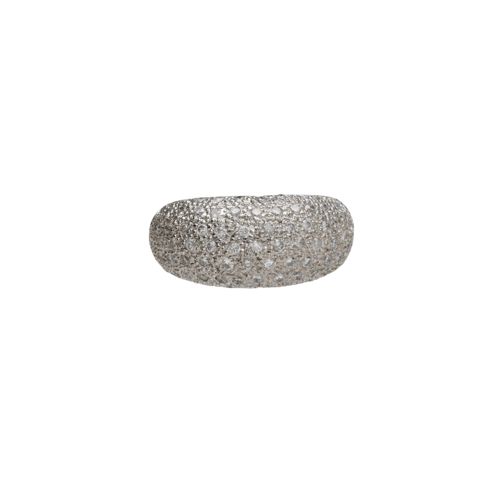 Cette remarquable bague jonc en or jaune et blanc 18k se distingue par son design large et affirmé. Son esthétique contemporaine met en valeur un pavage lumineux de diamants totalisant environ 1 carat, offrant un éclat homogène et raffiné.