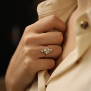 Le diamant central est sublimé par deux diamants taille ancienne de 0,10 carat chacun, venant encadrer la pierre principale avec élégance. Cette composition équilibrée met en lumière la beauté du diamant central tout en apportant une harmonie visuelle raffinée.