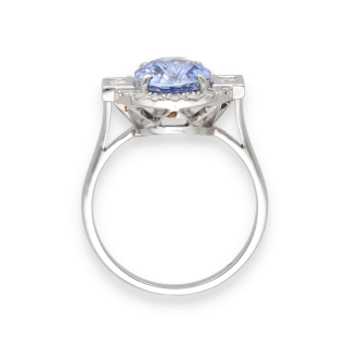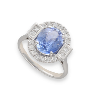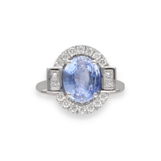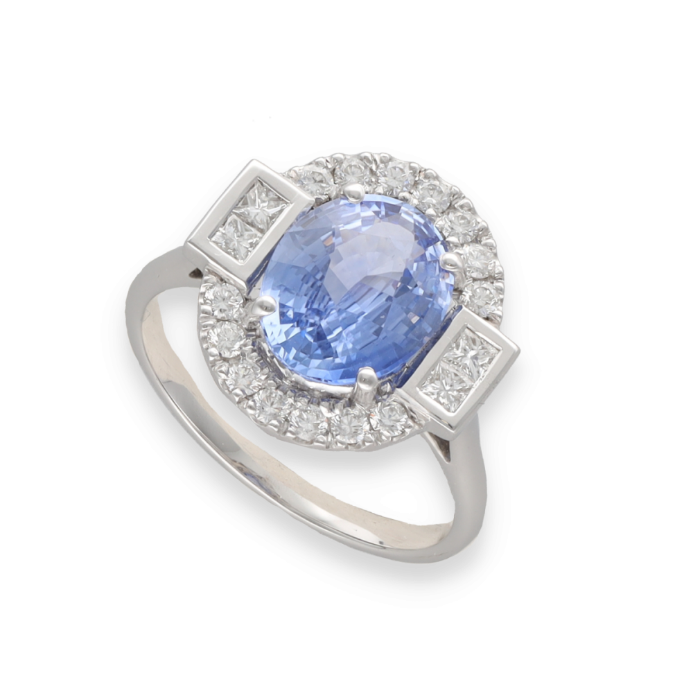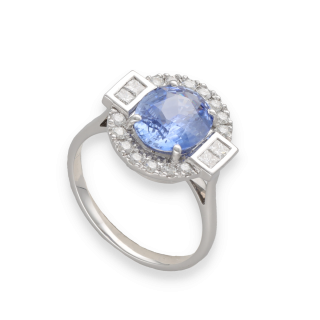 Elle est ornée en son centre d’un magnifique saphir de Ceylan naturel de 2.88 carats, d’une teinte bleue intense et lumineuse, mis en valeur par un entourage de diamants brillants totalisant environ 0.50 carat.