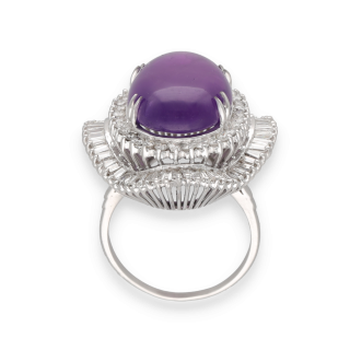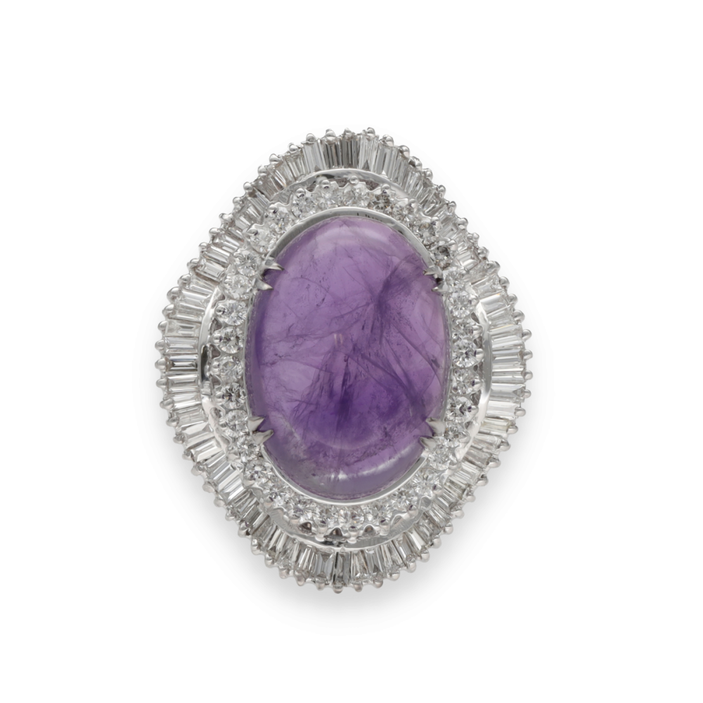 Confectionnée en or gris 18k, elle présente en son centre une améthyste cabochon d’une belle couleur violette profonde, entourée d’environ 4.0 carats de diamants taille trapèze et baguette de qualité G-VS, offrant un superbe jeu de lumière.