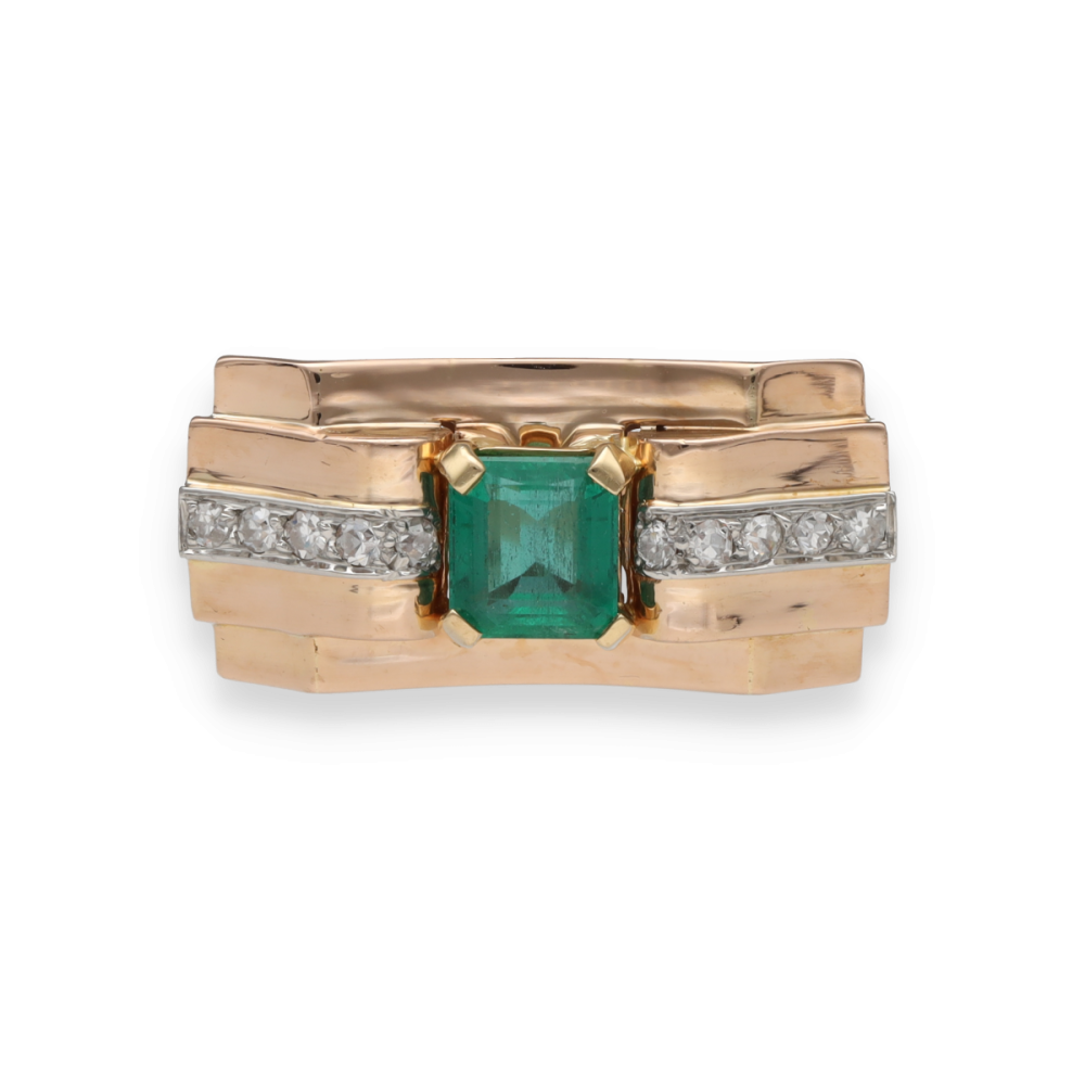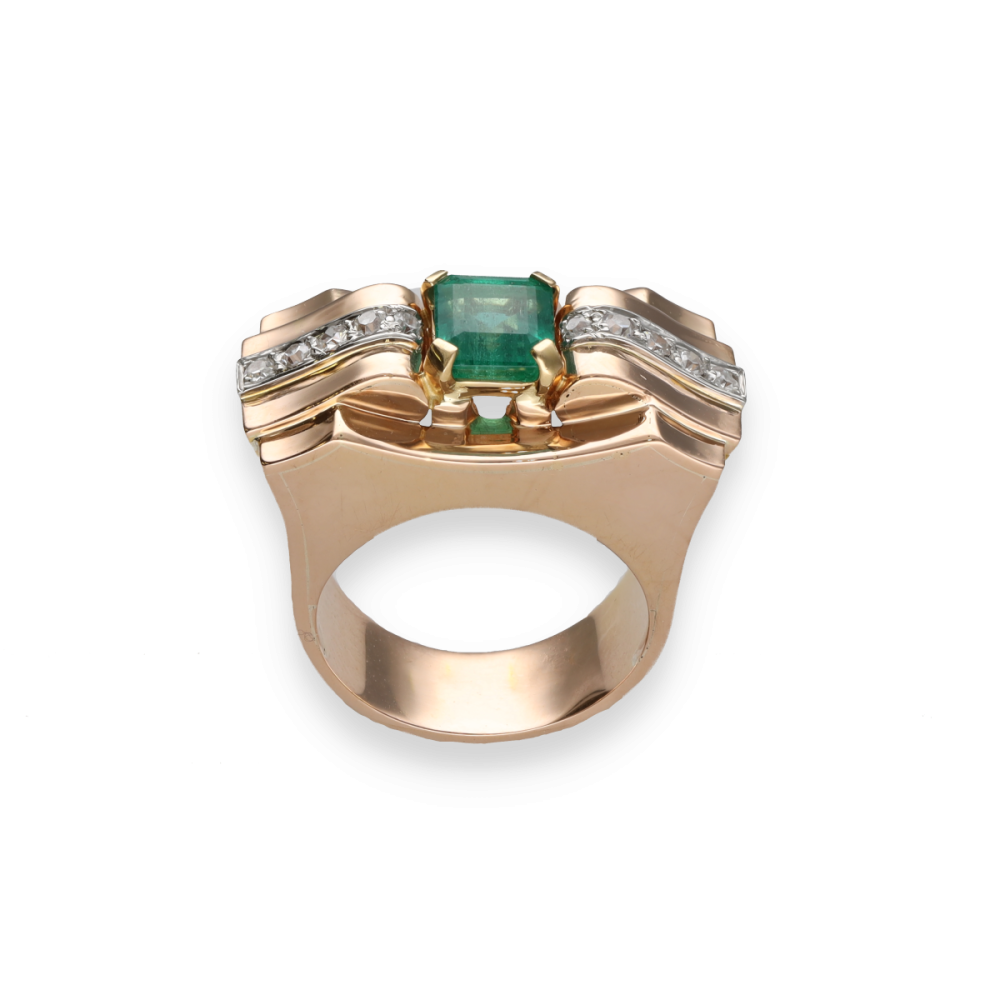 Imposante et élégante, cette bague Tank des années 1940 illustre parfaitement le style audacieux et géométrique de l’après-guerre.