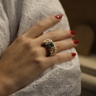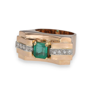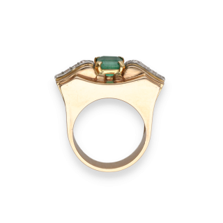 Réalisée en or jaune 18 carats, elle est ornée en son centre d’une émeraude d’environ 0,7 carat, au vert profond et lumineux, accompagnée de 10 diamants pour un poids total d’environ 0,3 carat.