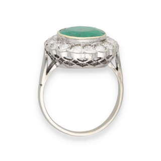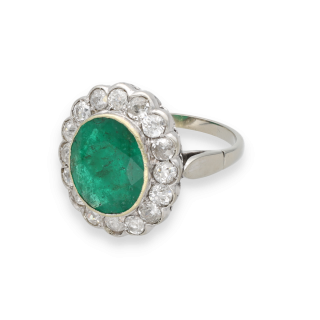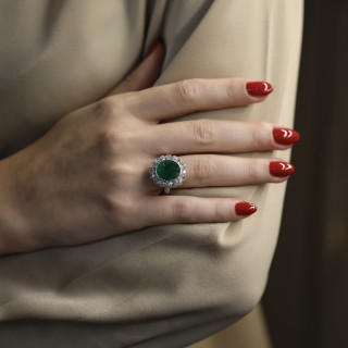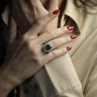 En son centre trône une superbe émeraude d’environ 6 carats, d’un vert profond et lumineux, magnifiquement mise en valeur par un entourage de 16 diamants totalisant environ 2 carats.