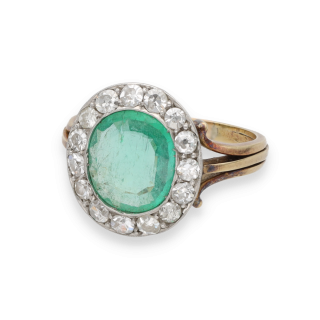 Réalisée en or blanc 18 carats, elle met en valeur une émeraude d’environ 3,5 carats, d’un vert lumineux et profond, encadrée par 14 diamants pour un poids total d’environ 1 carat.