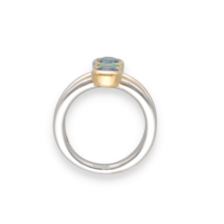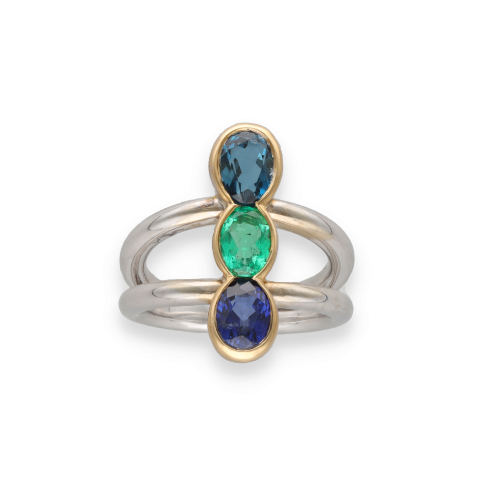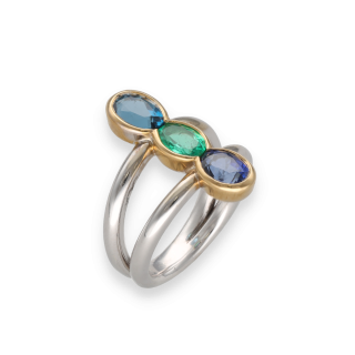 Cette élégante bague trilogie combine harmonieusement l’or gris et l’or jaune 18k, créant un contraste raffiné qui met en valeur la beauté des trois pierres précieuses qui la composent :