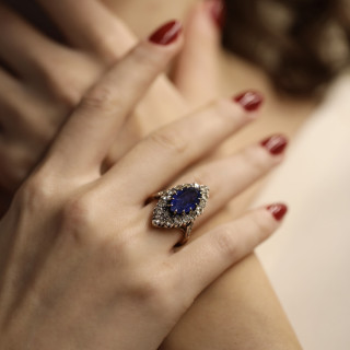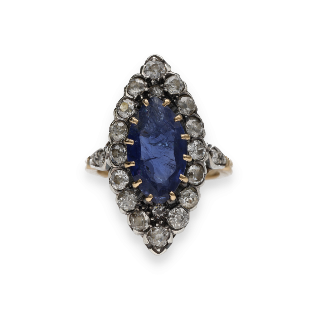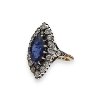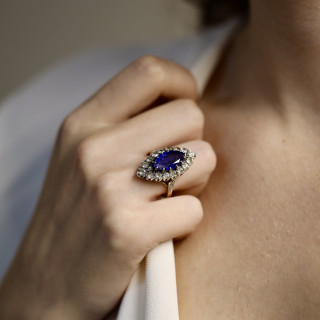 Elle est centrée d’un somptueux saphir de Ceylan taille marquise, d’un bleu éclatant, pesant environ 4 carats, pierre précieuse très appréciée pour sa luminosité et sa couleur vivante.