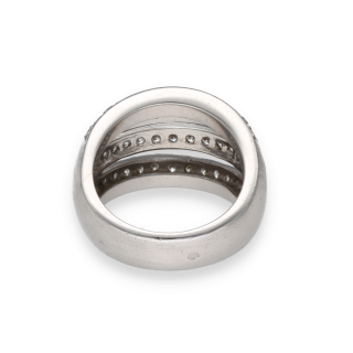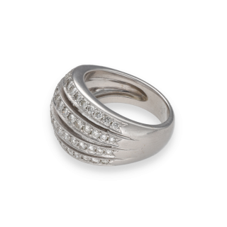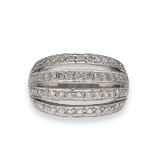 Élégante et structurée, cette bague dôme en or blanc 18 carats se distingue par son design ajouré composé de quatre anneaux parallèles, chacun entièrement pavé de diamants.