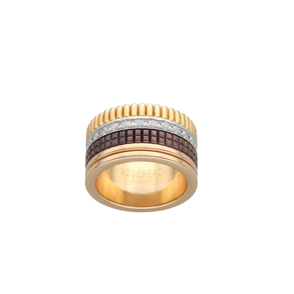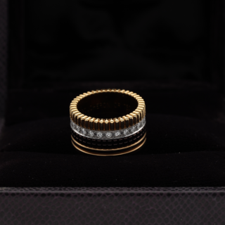 Cette bague Boucheron Modèle Quatre Large incarne l'élégance audacieuse de la maison à travers une création emblématique en or jaune 18k et diamants. Son design affirmé en fait une pièce de caractère, à la fois précieuse et intemporelle. Réalisée en 2008, elle se distingue par de belles proportions avec une largeur de 11,5 mm et une hauteur de 2,2 mm, offrant une présence remarquable au doigt tout en conservant une ligne élégante. Sa taille 51 en fait un bijou prêt à porter pour une allure raffinée au quotidien comme lors des grandes occasions. Cette bague est accompagnée de sa boîte d'origine et de sa facture d'origine, des éléments particulièrement appréciés pour une pièce de joaillerie signée. Sa référence de marque JRG0062351 et son prix neuf de 11 800€ soulignent le standing de ce modèle recherché. Proposée à 7 800€, cette création Boucheron séduit par son style iconique et la noblesse de ses matériaux. Une bague de luxe au charme puissant, idéale pour enrichir une collection ou marquer un moment précieux avec une pièce signée.- Neuf
