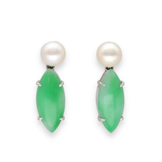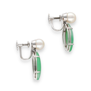 Confectionnées en or gris 18k, elles présentent une composition élégante de jade vert doux et de perles de culture nacrées, créant un contraste délicat entre la transparence de la pierre et l’éclat soyeux des perles.