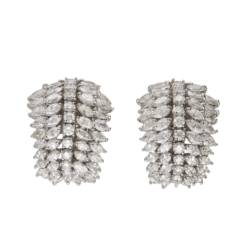 Entièrement pavées de diamants taille brillant et taille navette, elles totalisent environ 12 carats de diamants, conférant à l’ensemble une présence lumineuse remarquable. Le motif, composé de 55 diamants, est structuré de manière à créer un effet de volume et de mouvement subtil.