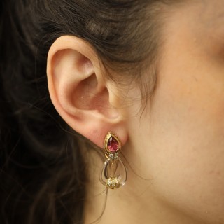 Ces puces d’oreilles en or jaune 18k incarnent une élégance délicate et lumineuse. Leur composition associe deux tourmalines de 1 ct chacune à 0,5 ct de diamants et cristal, créant un jeu de lumière subtil et raffiné. Le contraste entre la chaleur de l’or jaune et l’éclat des pierres confère à ce bijou une présence précieuse, à la fois discrète et remarquée. Leur silhouette équilibrée met en valeur un style intemporel, idéal pour accompagner aussi bien une tenue quotidienne qu’une occasion particulière. Avec un poids brut de 10,7 grs, une longueur de 15 mm et une hauteur de 3 cm, ces boucles d’oreilles offrent une belle présence tout en conservant une allure élégante. Réalisées vers 2000, elles séduiront les amateurs de joaillerie à la recherche d’une pièce raffinée au charme durable. Cette paire constitue un choix précieux pour enrichir une collection ou offrir un bijou de caractère, porté par la noblesse de l’or jaune et l’éclat des tourmalines, diamants et cristal.- Neuf
