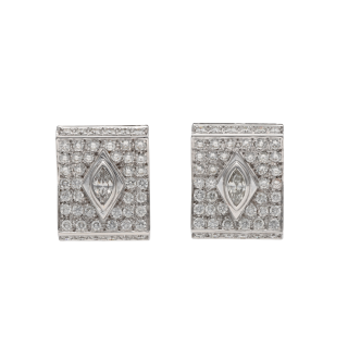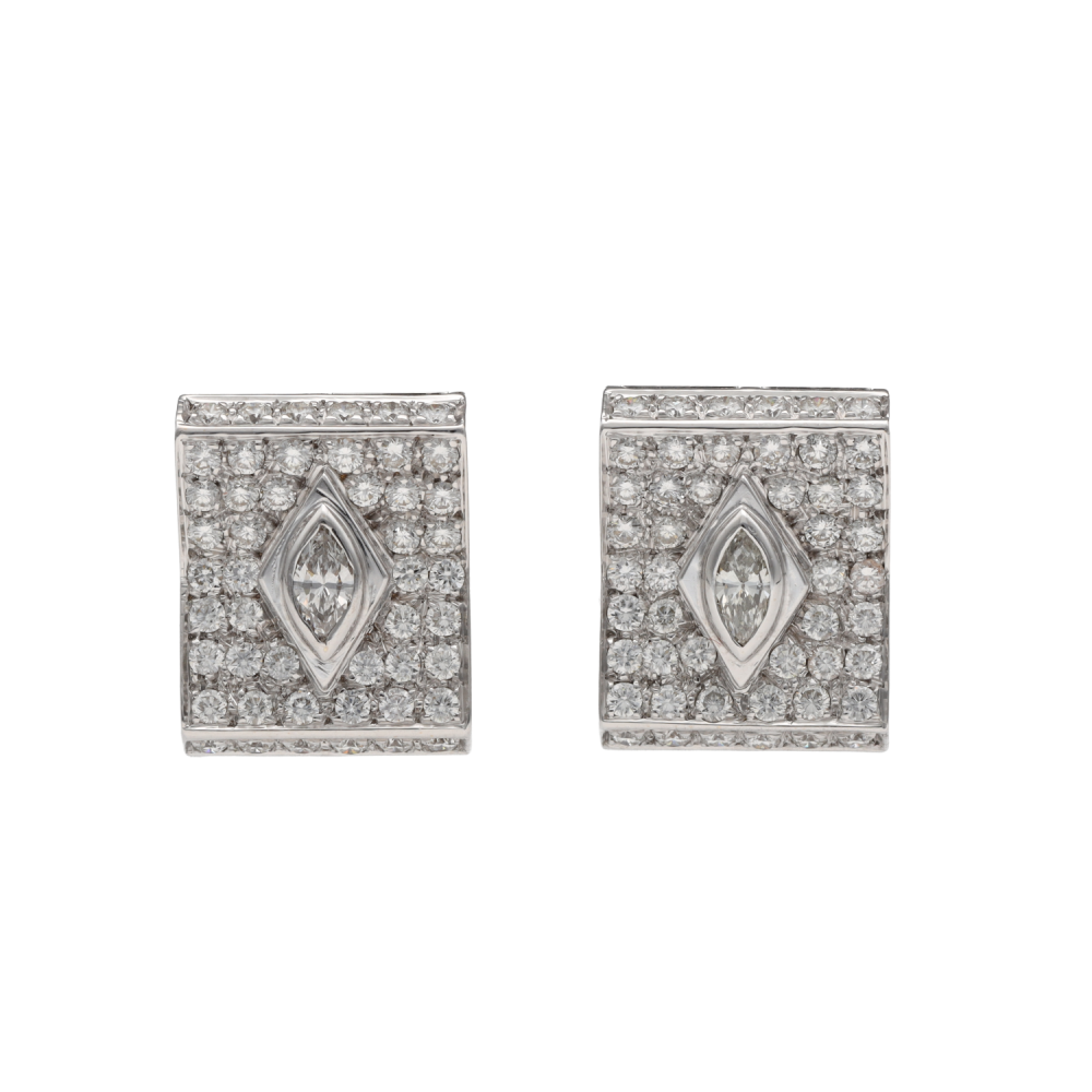 Ces boucles d'oreilles en or gris 18k séduisent par leur allure élégante et leur présence raffinée. Elles sont serties d'environ 3,50 carats de diamants brillants et marquises, offrant un jeu de lumière subtil et précieux. Leur composition met en valeur l'éclat des diamants dans un design harmonieux, à la fois sophistiqué et intemporel. Le contraste entre les tailles brillants et marquises apporte du rythme et du relief à l'ensemble, pour un rendu particulièrement délicat. Avec un poids brut de 17,90 grammes, une largeur de 16 mm et une longueur de 20 mm, cette paire présente de belles proportions. Datant de vers 2000, elle incarne un style joaillier toujours actuel, facile à porter comme à collectionner. Ces boucles d'oreilles sont une pièce de choix pour celles qui recherchent un bijou en diamant à la fois raffiné, lumineux et durable. Une création précieuse qui accompagnera avec élégance les plus beaux moments.- Neuf