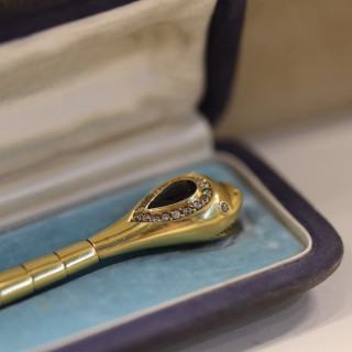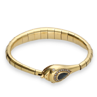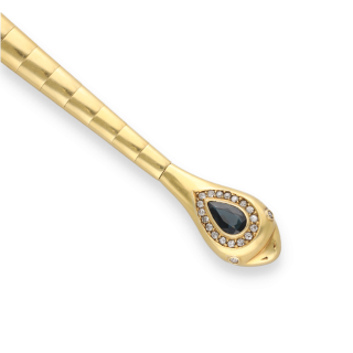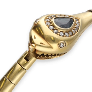La tête du serpent est ornée d’un saphir taille poire d’environ 2 carats, d’une belle teinte bleue soutenue, entouré de diamants totalisant environ 0,3 carat.