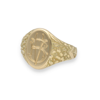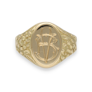 Importante chevalière pour homme en or jaune 18 carats, finement gravée de motifs décoratifs et des initiales BV. Poids 18,5 g, largeur 17 mm. Taille 62, mise à taille offerte. Gravure personnalisée possible dans notre atelier.