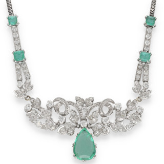 Collier Pendentif en or gris 18 carats serti de 6 émeraudes et de 2,80 carats environ de diamants taille ancienne vers 1950.