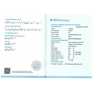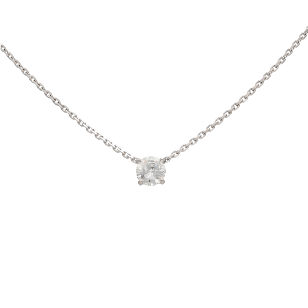 Le pendentif est serti d’un diamant taille brillant de 0,90 carat, présentant une couleur E, située dans les toutes premières positions de l’échelle de blancheur, et une pureté VS2, garantissant une pierre très propre à l’œil nu.