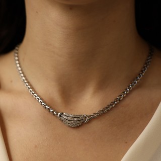 La monture en or blanc 18k met parfaitement en valeur l’éclat des diamants, apportant une touche de modernité et de sophistication. Le design équilibré et élégant en fait un collier idéal pour sublimer le port de tête avec discrétion et raffinement.
