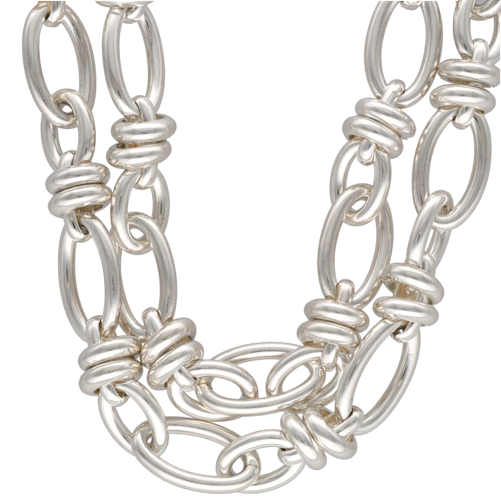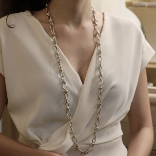Ce collier Pomellato en argent incarne une élégance sobre et affirmée, fidèle à l esprit des belles pièces de joaillerie. Sa ligne raffinée et sa présence remarquable en font un bijou qui attire immédiatement le regard. Avec une longueur de 100 cm, il offre un porté fluide et sophistiqué, idéal pour souligner la silhouette avec distinction. Son poids brut de 188,90 grs révèle une pièce de belle consistance, pensée pour celles et ceux qui apprécient les bijoux au caractère singulier. Ses dimensions de 11 x 19 cm renforcent encore son allure et sa personnalité. Ce collier se distingue par son style intemporel, capable d accompagner aussi bien une tenue quotidienne qu une allure plus habillée. Proposé sous la référence FB11365, ce collier Pomellato est vendu sans boîte d origine et sans papiers d origine. Une création précieuse au charme évident, destinée aux amateurs de bijoux de maison reconnue.- Neuf