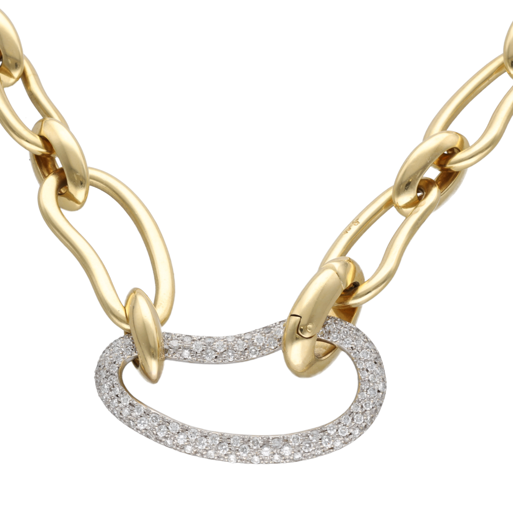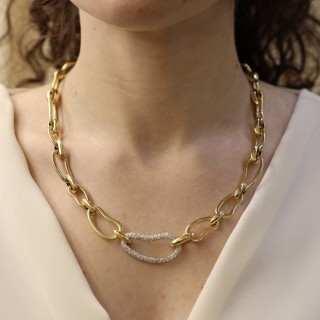 Ce collier Pomellato modele Paisley incarne l'elegance d'une joaillerie au style affirme. Realise en or jaune 18k et or gris 18k, il se distingue par une presence precieuse et un dessin raffine qui mettent en valeur toute la singularite de la maison. Orne de diamants taille brillants pour un total de 1,30 carat, il capte delicatement la lumiere et souligne le caractere sophistique de la piece. L'association des deux ors apporte un contraste subtil, a la fois moderne et intemporel. Avec sa longueur de 52 cm, ce collier offre un beau tomber au porter. Son motif de 38 x 19 mm affirme une allure elegante, tandis que son poids brut de 122,90 grammes souligne la noblesse de sa fabrication. Date de vers 2016, ce collier Pomellato seduira les amateurs de bijoux de caractere a la recherche d'une piece precieuse, distinctive et facile a porter. Une creation de luxe qui traverse le temps avec style et raffinement.- Neuf