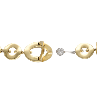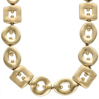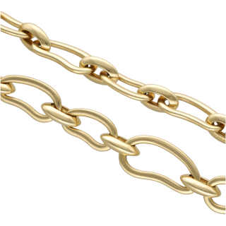 Ce collier Pomellato Modele Maillon Geometrique seduit par la force de son design et l elegance de ses finitions. Realise en or jaune 18k, il associe subtilement des surfaces lisses et brossees pour offrir un jeu de matieres raffine et contemporain. Son fermoir en or gris 18k, rehausse de diamants, apporte une touche lumineuse et precieuse a l ensemble. Ce contraste entre l or jaune et l or gris souligne le caractere sophistique de la piece tout en mettant en valeur son style graphique distinctif. Avec une longueur de 42 cm, ce collier epouse joliment le port de tete et habille le decollete avec presence. Son poids brut de 108 grs temoigne d une fabrication genereuse et d une belle densite, signature d un bijou de luxe pense pour traverser le temps. Piece de caractere, ce collier Pomellato conjugue modernite, allure et savoir faire joaillier. Une creation elegante pour celles qui recherchent un bijou remarquable, a la fois intemporel et affirme.- Neuf