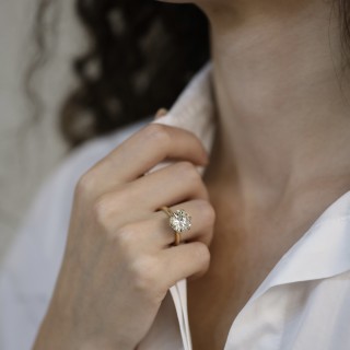 Ce solitaire d’exception, monté en or jaune 18K, met à l’honneur une pierre centrale remarquable : un diamant taille brillant de 3,53 carats, de qualité L-VVS2, accompagné de son certificat HRD. Sa couleur chaude (L) combinée à une très haute pureté (VVS2) lui confère un éclat solaire et profond, parfait pour une monture en or jaune.