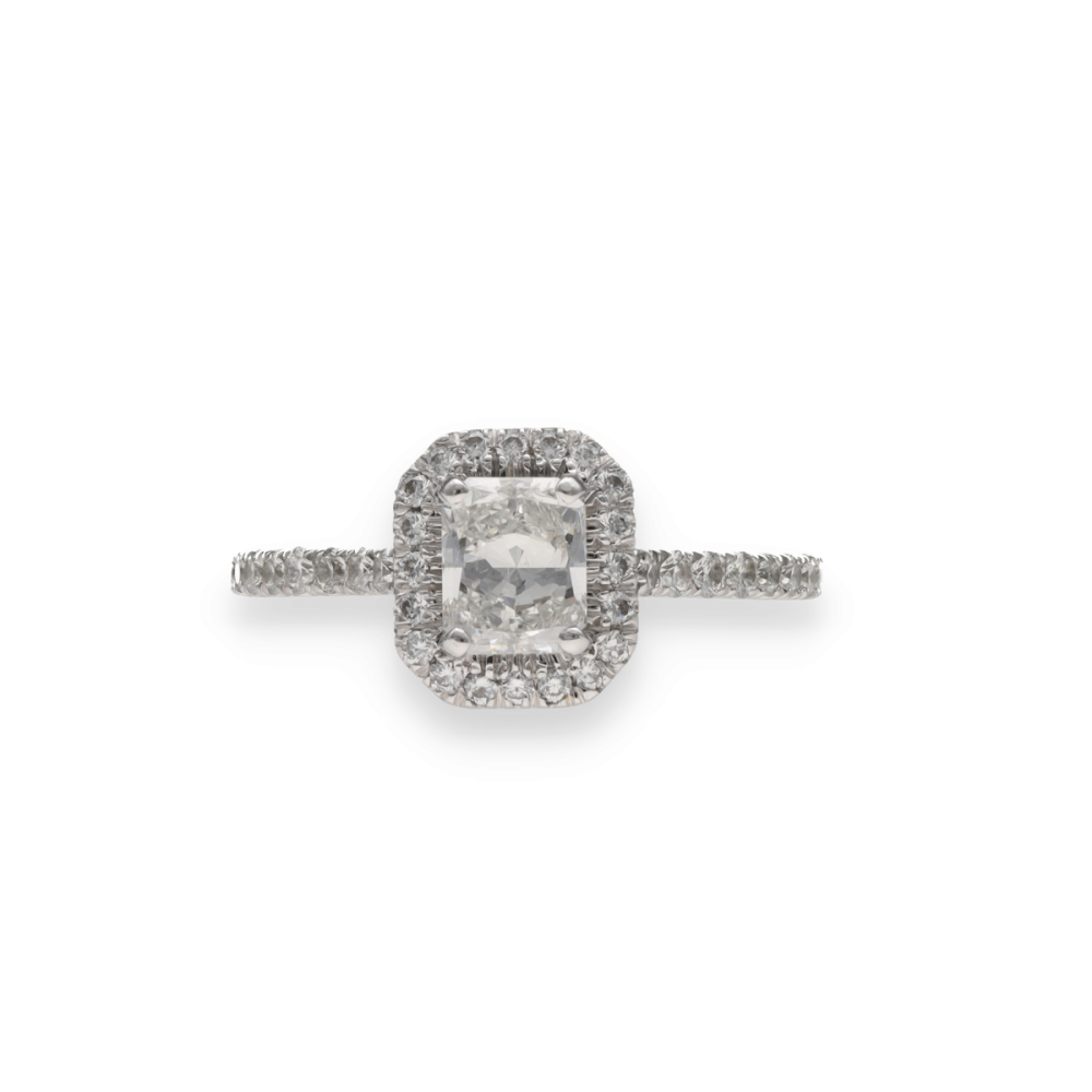 Autour de la pierre principale, un entourage délicat de diamants G-VS, totalisant environ 0,50 carat, renforce l’intensité et la brillance de l’ensemble.