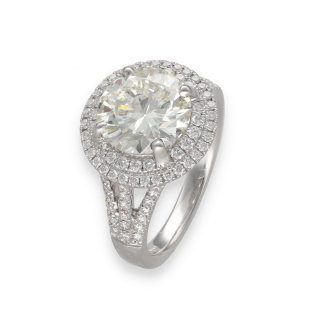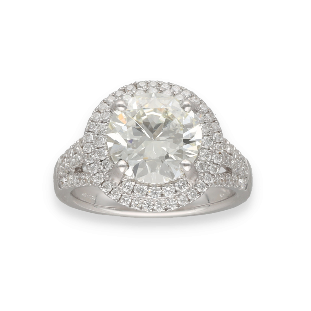 Exceptionnelle par son éclat et sa pureté, cette bague solitaire en or gris 18k est centrée d’un magnifique diamant taille brillant de 3,06 carats, classé L – VVS2 et accompagné de son certificat HRD.