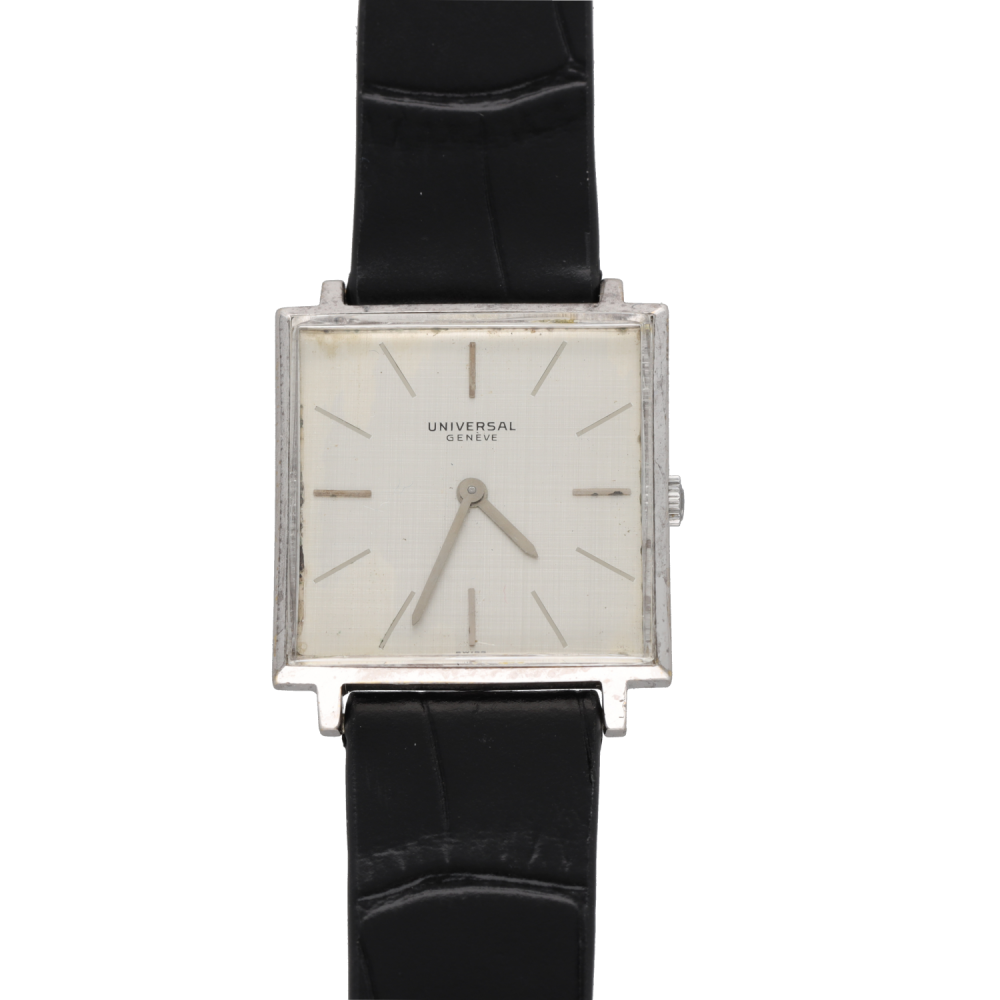Montre Universal Genève en acier, avec mouvement mécanique, boîtier 27 x 27 mm, vers 1965, avec boucle ardillon.