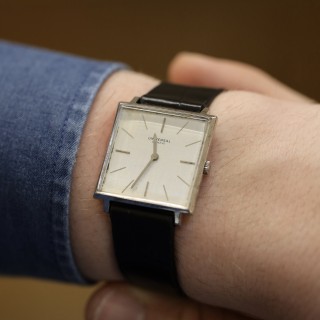 Le boîtier en acier offre une allure à la fois discrète et élégante, parfaitement adaptée à un usage quotidien. Son format 27 x 27 millimètres lui confère une présence harmonieuse au poignet, avec une esthétique typique des montres des années 60.