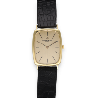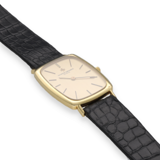 Montre Vacheron Constantin vintage de 1977 en or jaune 18k extraplate, réf. 7590, équipée du calibre 1003. Dimensions 30 × 24 mm, épaisseur 4 mm. Vendue avec papier d’origine, sans boîte.