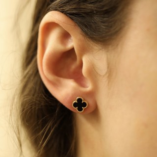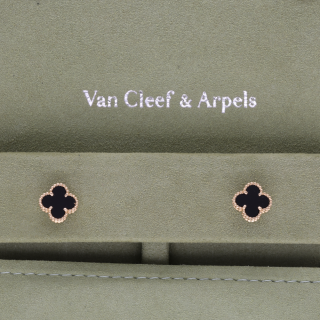 Délicates boucles d’oreilles Van Cleef & Arpels Sweet Alhambra réf. VCARA44900 en or rose 18k, ornées d’onyx. Modèle iconique, livré en full set de 2023.
